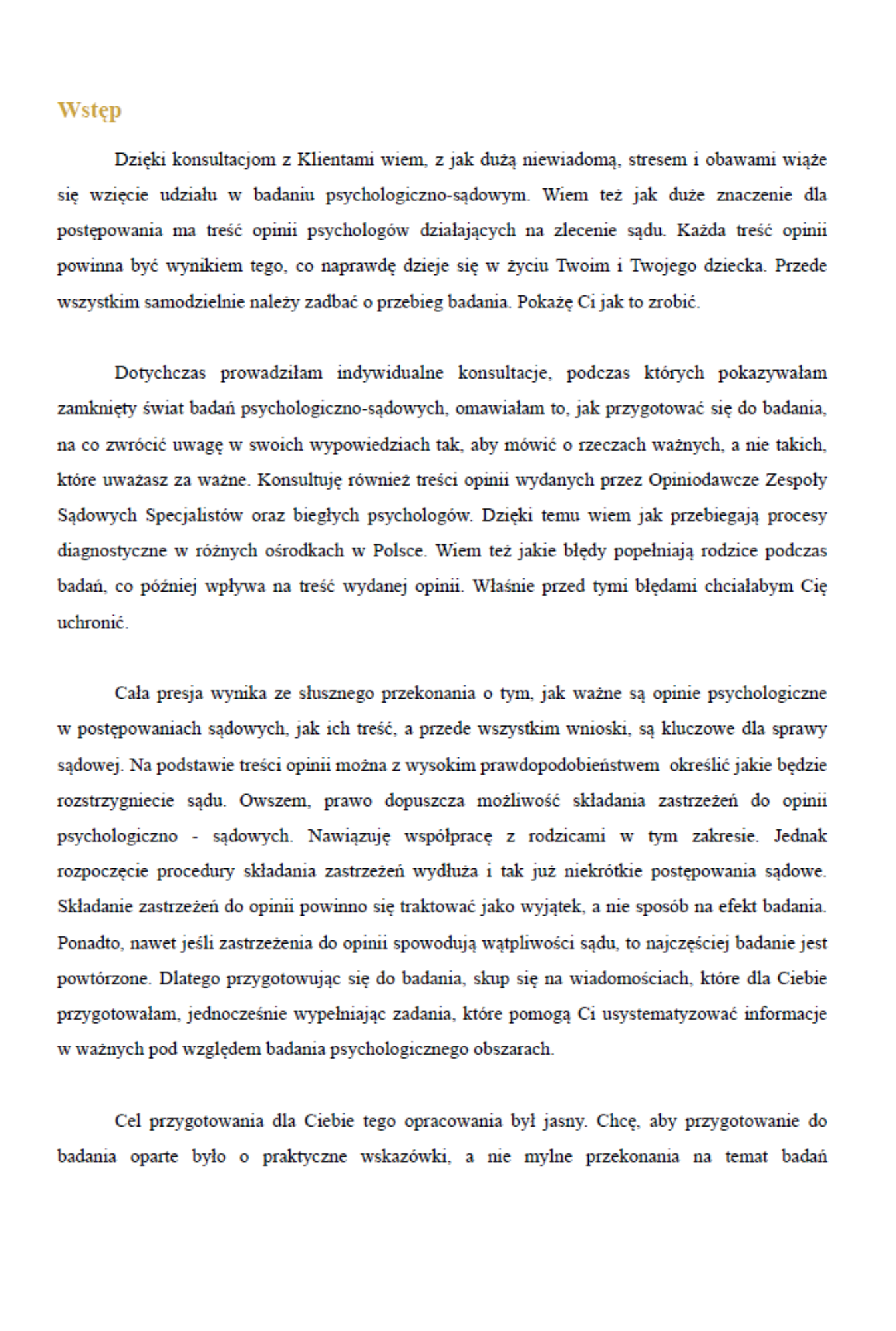 Jeśli chcesz zwiększyć swoje szanse na pozytywną opinię, ale nie wiesz, od czego zacząć, ten e-book to idealne rozwiązanie. Znajdziesz tu zarówno kluczowe informacje, na co zwracają uwagę biegli, jak i praktyczne wskazówki, które pomogą Ci uniknąć błędów popełnianych przez rodziców w trakcie badania.